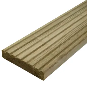Premium Redwood Pine timber decking board, pressure treated, and grooved for durable and safe decking in stock now in lengths of 3m, 3.6m, 4.2m, 4.8m & 5.4m.