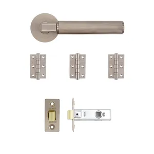 Complete Door Hardware Solution: An all-inclusive kit with handles, a latch, and hinges, providing everything needed for a seamless and professional installation on a standard interior door.