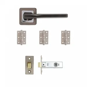 Complete Door Hardware Solution: An all-inclusive kit with handles, a latch, and hinges, providing everything needed for a seamless and professional installation on a standard interior door.