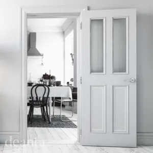 Rochester White Primed Glazed - This door has a style of its own – modestly traditional, with a contemporary twist. Four symmetric panels give it a somewhat old-fashioned appearance, but sits comfortably in any modern setting. Featuring two panes of clear toughened glass in place of the top panels, allowing more light to enter your room.