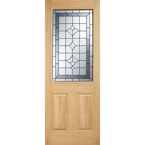 A decorative part obscure double glazed panel is positioned above two raised shaped panels in an Oak material for this Winchester design.