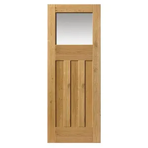 The Rustic Oak DX Glazed Internal Door combines classic style with modern safety. This fully finished, solid core door features a real oak veneer with a natural knotty appearance, paired with opaque glass panels. Perfect for adding light and character to your home.
