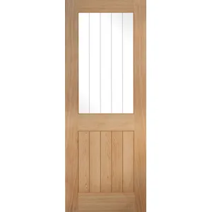 The ever so popular five vertical panel design showcasing geometry in unfinished oak has a modern twist on a traditional style with the added benefit of a clear glazing panel with frosted lines which replaces half of the unfinished oak to let the light shine through.