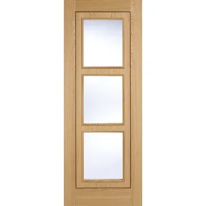 This stylish internal door features a contemporary design with three center clear glazed panels, raised molding, and a grooved frame. The pre-finished Oak finish showcases natural wood grain, while the Walnut inlay adds a touch of sophistication. It's crafted with a solid engineered core for strength and durability and is ready to install.