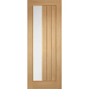 A modern adaption of our classic Mexicano oak internal door. Featuring an offset, long clear glazed panel and square cut vertical grooves, this would look great in rooms that require some natural light to flood through.