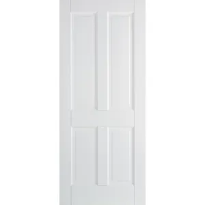 The classic Canterbury door design features four rectangular raised shaped panels with a primed solid core and a white finish.