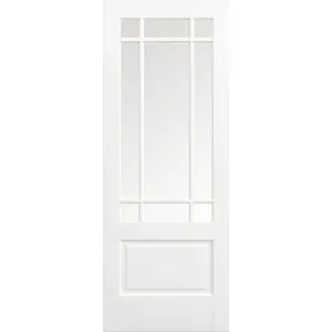 Clear bevelled glazed panels feature decorative bars, with a raised shaped panel in a primed solid core and a white finish.