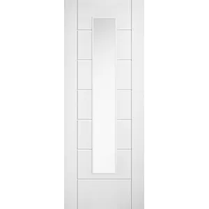 The White Laminate Linear 7P Glazed Door is a stylish and contemporary addition to any modern interior. This door features a clear glazed panel, allowing natural light to flow freely throughout your home, creating a bright and airy atmosphere. The distinctive vertical grooves add visual interest and character, while the sleek white laminate finish provides a durable and easy-to-maintain surface. The semi-solid core provides a balance of strength and affordability, ensuring this door remains a beautiful and functional feature in your home for years to come.   Key Features: Natural Light: Clear glazed panel allows natural light to flood any room.   Stylish Design: Distinctive vertical grooves and sleek white laminate create a modern aesthetic. Balance of Strength and Affordability: Semi-solid core offers a good balance of strength and value.   This door is fully finished and ready for immediate installation. It also comes with a 10-year manufacturer's conditional warranty