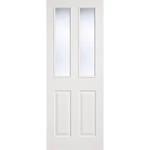 Two clear glazed panels are positioned above two raised shaped panels, with raised moulding on both sides and a white composite.
