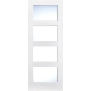 The White Shaker Glazed 4L Door is a stylish and contemporary addition to any modern interior. This door features a simple and clean design with four equal sized clear glazed panels, allowing natural light to flow freely throughout your home, creating a bright and airy atmosphere. The white primed finish provides a versatile backdrop for any decor, allowing for easy customization. The solid engineered core provides exceptional strength and durability, ensuring this door will remain a beautiful and functional feature in your home for years to come.