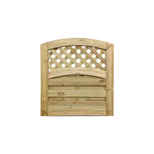 The Elite Meloir Gate has a simple, decorative look with a curved top and grooved crisscross pattern. It's built super strong with special joints for high winds and treated to last a long time. You can hang it from either side, and there are matching fence panels and trellis available.